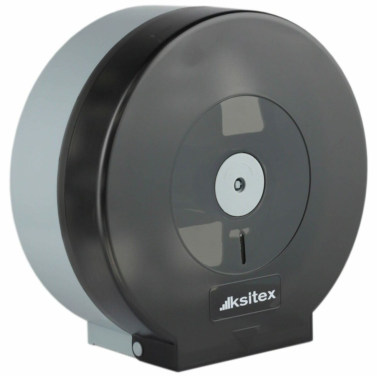Диспенсер туалетной бумаги в больших рулонах выполнен из черного прозрачного пластика.