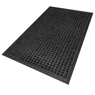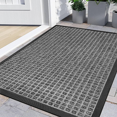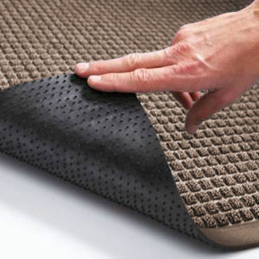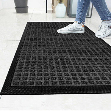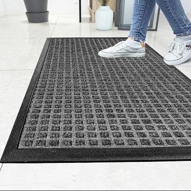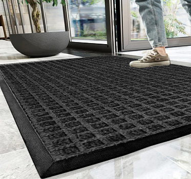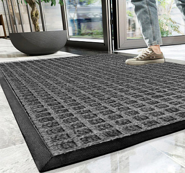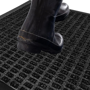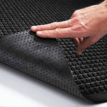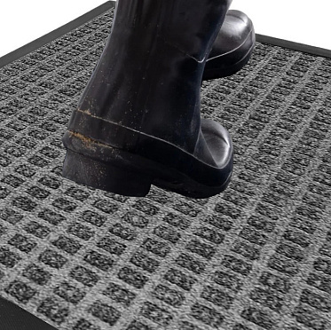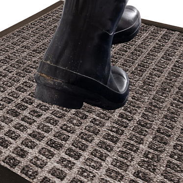 Грязезащитный коврик состоит из жесткого стеганного ворса с рельефным рисунком. Резиновая подложка с шипами предотвращает смещение коврика. Приподнятые резиновые края канта со всех четырех сторон образовывают сдерживающий барьер, за счет которого грязезащитный коврик может удерживать до шести литров влаги на квадратный метр.