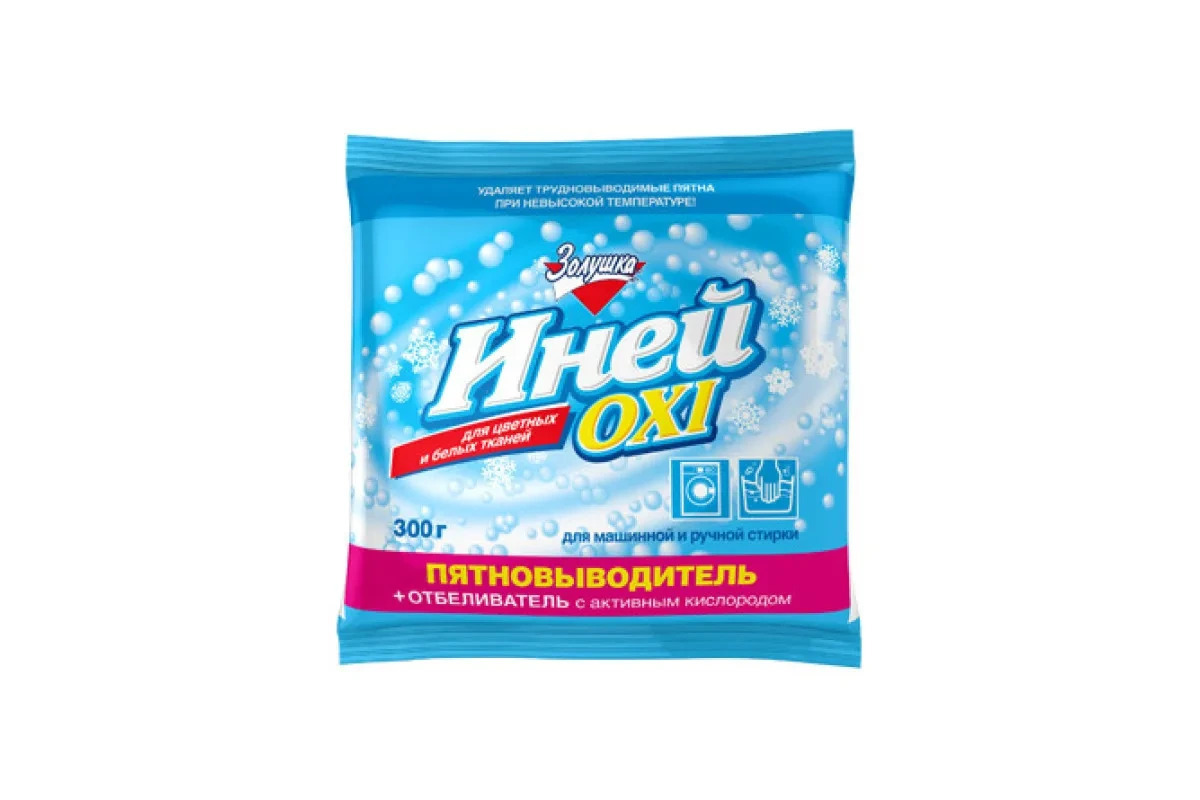 Удаление пятен при машинной стирке: Для удаления несильных пятен и загрязнений засыпать 1 мерную ложку (50 г) пятновыводителя «Иней OXI» вместе со стиральным порошком в соответствующий отсек стиральной машины (см. инструкцию к стиральной машине) для предварительной или основной стирки. Для удаления сильных пятен и застарелых загрязнений использовать 2 мерные ложки (100 г) пятновыводителя.