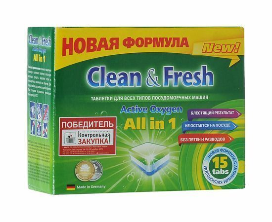 Таблетки для посудомоечной машины CLEAN&FRESH 5 в 1 (15 шт.) Применение таблеток облегчает использование посудомоечных машин. Дополнительные вещества, входящие в состав таблеток защищают машину от образования накипи на нагревательных элементах, способствуют лучшему результату при мытье посуды, существенно экономят ваше время. Удаляют даже самые сильные загрязнения.