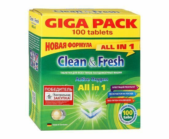 Таблетки для посудомоечной машины CLEAN&FRESH 5 в 1 (100 шт.) Применение таблеток облегчает использование посудомоечных машин. Дополнительные вещества, входящие в состав таблеток защищают машину от образования накипи на нагревательных элементах, способствуют лучшему результату при мытье посуды, существенно экономят ваше время. Удаляют даже самые сильные загрязнения.