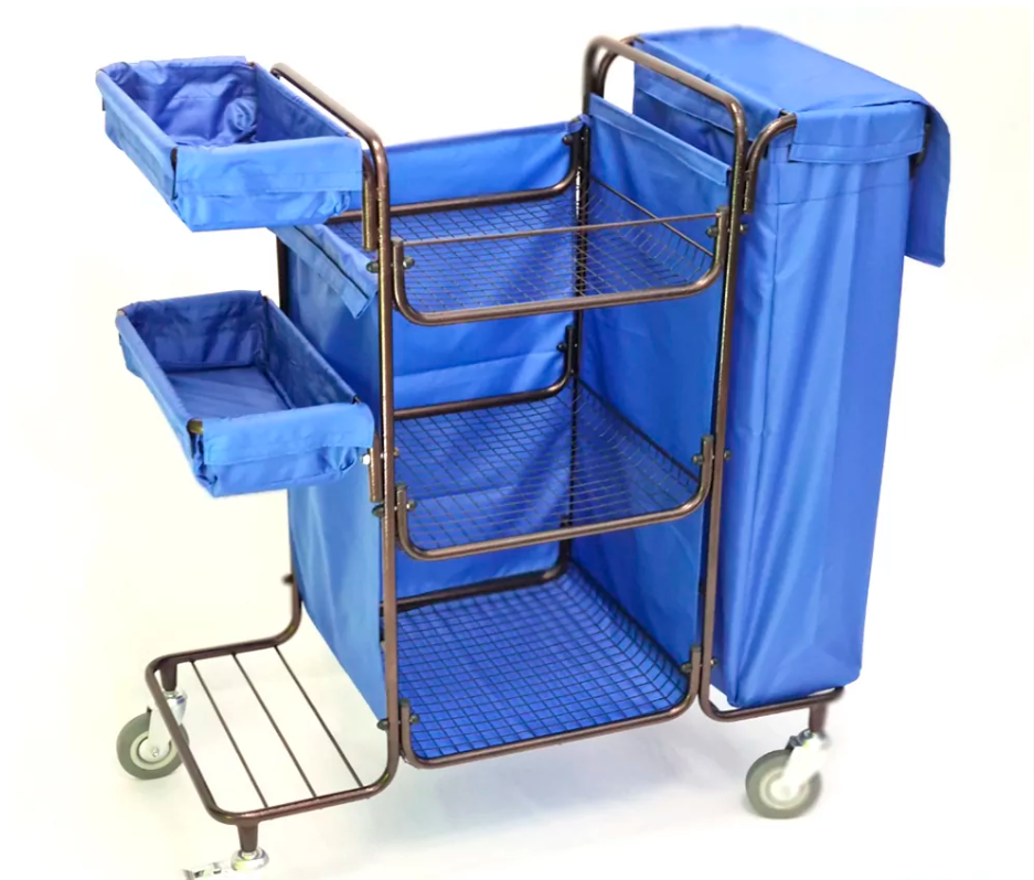 Гостиничная тележка используются для одновременного проведения всех работ по обслуживанию номерного фонда в гостиницах, отелях, домах отдыха, санаториях, палат в больничных комплексах, госпиталях. Модель тележки комплектуется тремя сетчатыми полками , мешком из высокопрочного нейлона 120 л на кронштейне.
