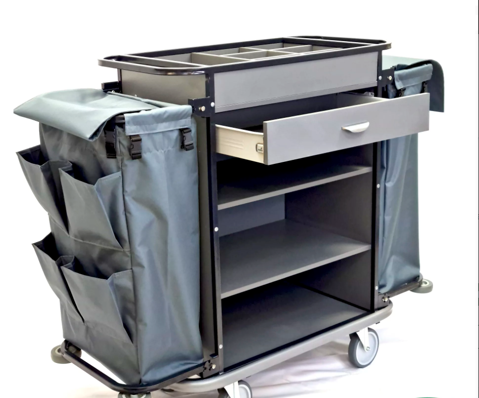 Тележка для горничных с полками из МДФ и 2-мя мешками на 110л. для сбора грязного белья. Каркас тележки изготовлен из мебельной трубы, покрытой полимерной порошковой краской. Полки изготовлены из МДФ. Задняя стенка и нижняя полка изготовлены из МДФ серого цветов. Размер полки 70х50 см. Верхняя полка имеет борта 10см. для моющих средств. Колеса все поворотные, серая резина не оставляет следов на полу, одно колесо с тормозом. Тележка полностью сварная. Мешок серого цвета.Конструкция из стальной трубы, откидные бортики для подвешивания мешков для белья.Нижние бортики с предохранительными решетками. Три фиксированные полки.