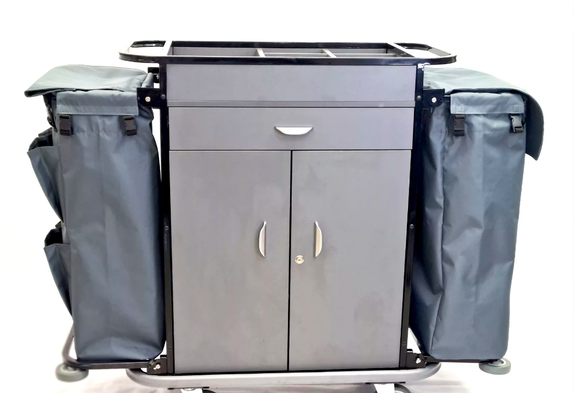 Тележка для горничных с полками из МДФ и 2-мя мешками на 110л. для сбора грязного белья. Каркас тележки изготовлен из мебельной трубы, покрытой полимерной порошковой краской. Полки изготовлены из МДФ. Задняя стенка и нижняя полка изготовлены из МДФ серого цветов. Размер полки 70х50 см. Верхняя полка имеет борта 10см. для моющих средств. Колеса все поворотные, серая резина не оставляет следов на полу, одно колесо с тормозом. Тележка полностью сварная. Мешок серого цвета.Конструкция из стальной трубы, откидные бортики для подвешивания мешков для белья.Нижние бортики с предохранительными решетками. Три фиксированные полки.