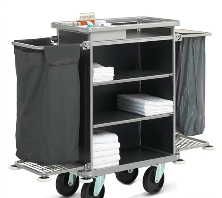 Тележка для горничных с полками из МДФ и 2-мя мешками на 110л. для сбора грязного белья. Каркас тележки изготовлен из мебельной трубы, покрытой полимерной порошковой краской. Полки изготовлены из МДФ. Задняя стенка и нижняя полка изготовлены из МДФ серого цветов. Размер полки 70х50 см. Верхняя полка имеет борта 10см. для моющих средств. Колеса все поворотные, серая резина не оставляет следов на полу, одно колесо с тормозом. Тележка полностью сварная. Мешок серого цвета. Конструкция из стальной трубы, откидные бортики для подвешивания мешков для белья. Нижние бортики с предохранительными решетками. Три фиксированные полки.