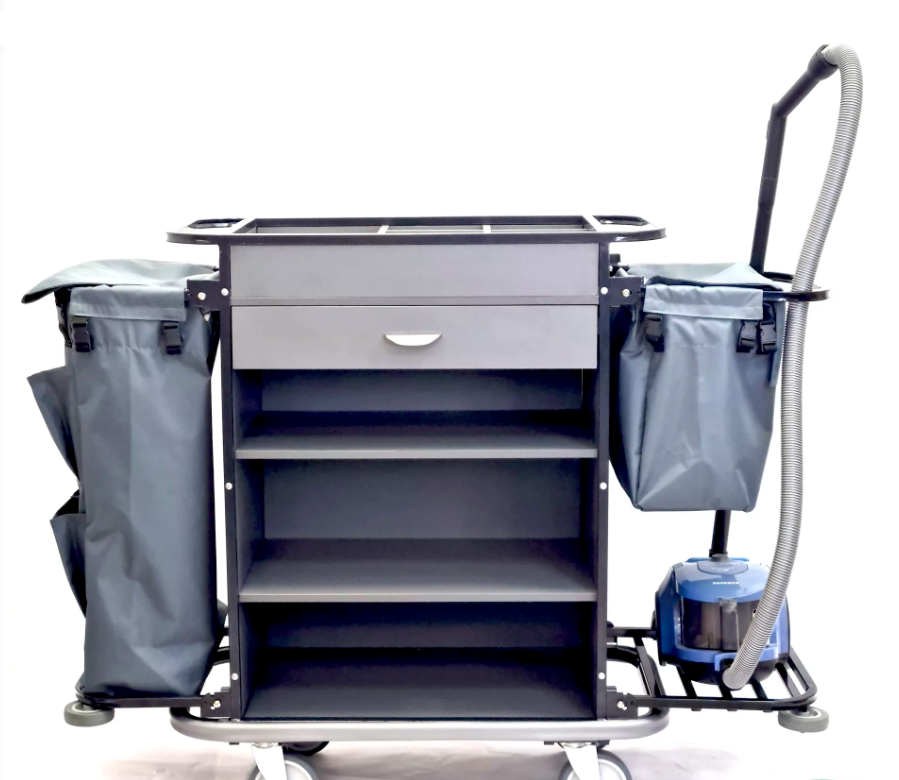 Тележка для горничных с полками из МДФ и 2-мя мешками на 110л. для сбора грязного белья. Каркас тележки изготовлен из мебельной трубы, покрытой полимерной порошковой краской. Полки изготовлены из МДФ. Задняя стенка и нижняя полка изготовлены из МДФ серого цветов. Размер полки 70х50 см. Верхняя полка имеет борта 10см. для моющих средств. Колеса все поворотные, серая резина не оставляет следов на полу, одно колесо с тормозом. Тележка полностью сварная. Мешок серого цвета.Конструкция из стальной трубы, откидные бортики для подвешивания мешков для белья.Нижние бортики с предохранительными решетками. Три фиксированные полки.