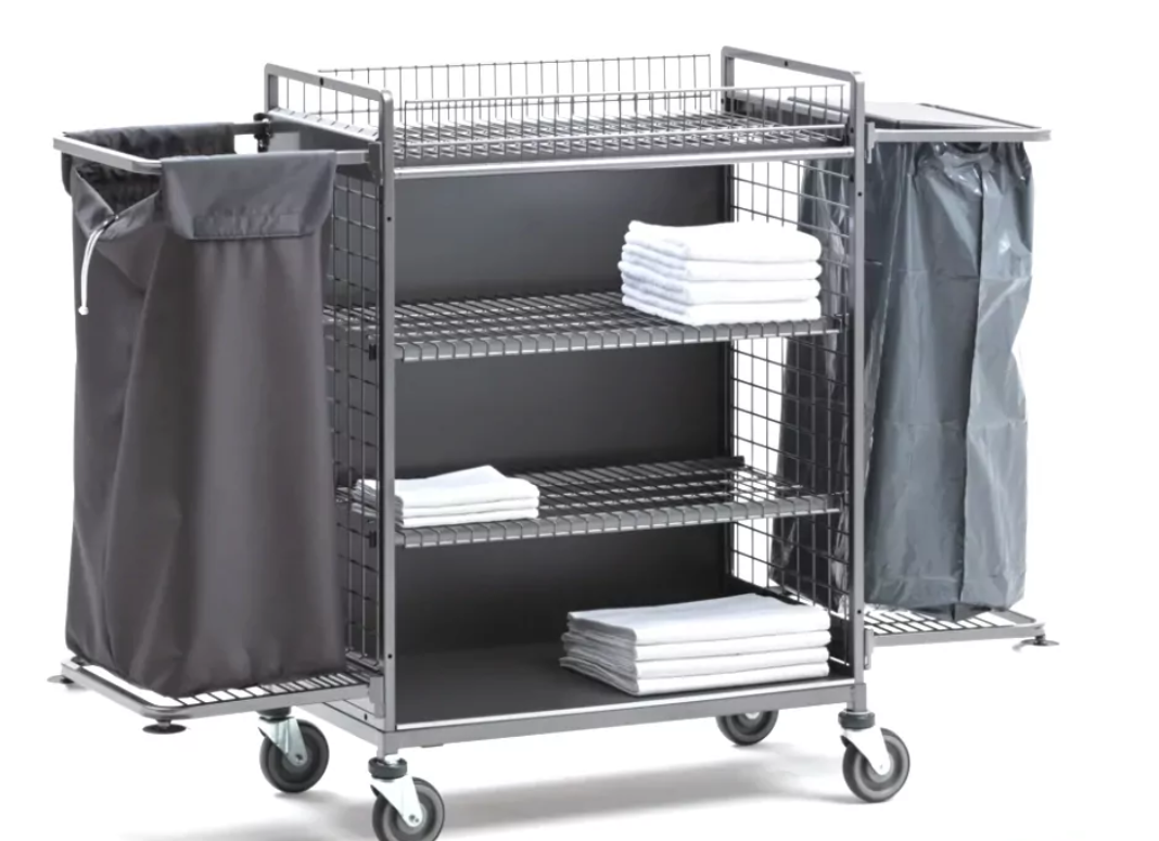 Тележка для горничных с полками из МДФ и 2-мя мешками на 110л. для сбора грязного белья. Каркас тележки изготовлен из мебельной трубы, покрытой полимерной порошковой краской. Полки изготовлены из сетки с полимерным покрытием. Задняя стенка и нижняя полка изготовлены из МДФ серого цветов. Размер полки 70х50см. Верхняя полка имеет борта 10см. для моющих средств. Колеса все поворотные, серая резина не оставляет следов на полу, одно колесо с тормозом. Тележка полностью сварная. Мешок серого цвета.