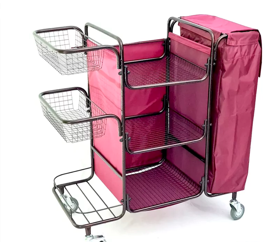 Гостиничная тележка используются для одновременного проведения всех работ по обслуживанию номерного фонда в гостиницах, отелях, домах отдыха, санаториях, палат в больничных комплексах, госпиталях. Модель тележки комплектуется тремя сетчатыми полками , мешком из высокопрочного нейлона 120 л на кронштейне.