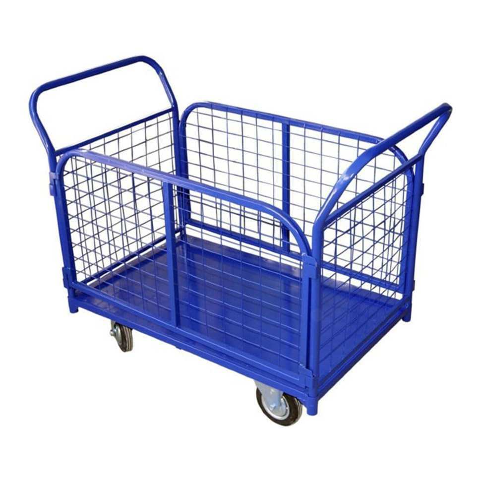 При изготовлении тележки используются металлические профильные трубы и трубы круглого сечения, настил надежно приваривается к каркасу методом точечной сварки. Платформенные тележки имеют различную высоту бортов и размер ячеек сетки, что влияет на калибр перевозимых грузов. Заполнение бортов и ручек — сетка с ячейкой 100x50 мм. Сетка изготовлена на высокоточном сварочном оборудовании. Высокие борта (500 мм) и наличие двух ручек добавляют удобства в эксплуатации и позволяют эксплуатировать тележку по принципу «тяни-толкай». Тележка изготовлена из высококачественных материалов. Каркас платформы изготавливается из профильной трубы 30x20 мм, настил металлический из листового металла 1 мм, ручки из трубы Д 25мм. На бортах установлены быстросъемные элементы, которые без применения инструмента позволяют производить и установку, и снятие. Наличие пружинных кронштейнов на бортах позволяет жестко пристегнуть быстросъемный борт к платформе тележки.